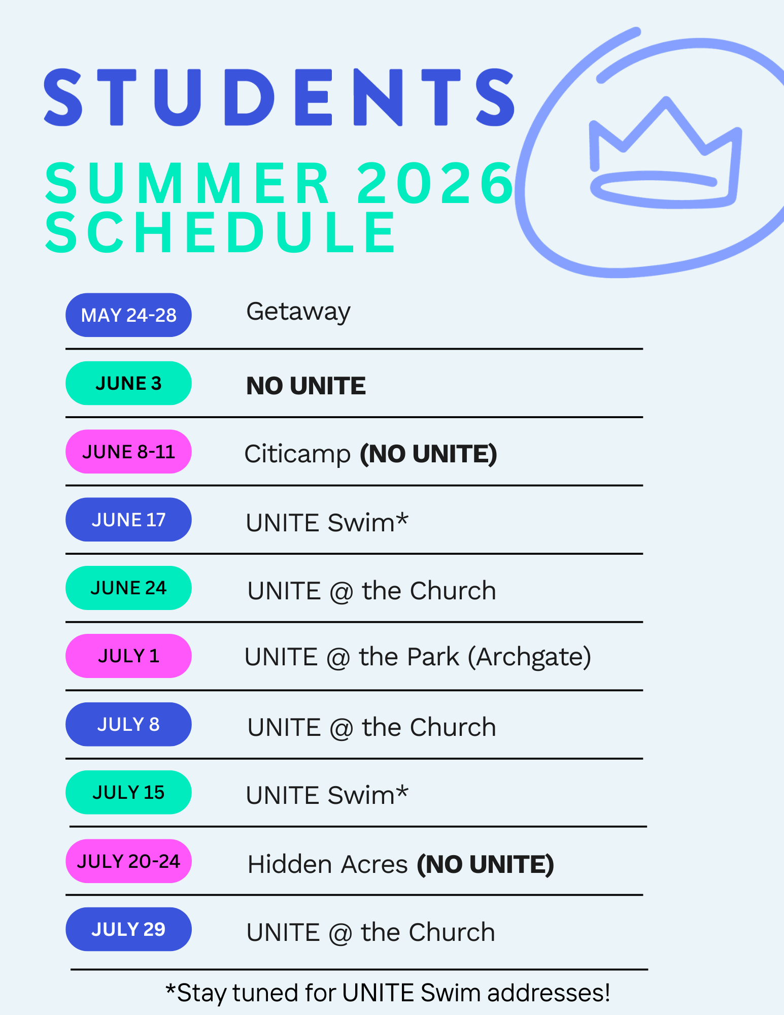 UNITE SUMMER SCHEDULE